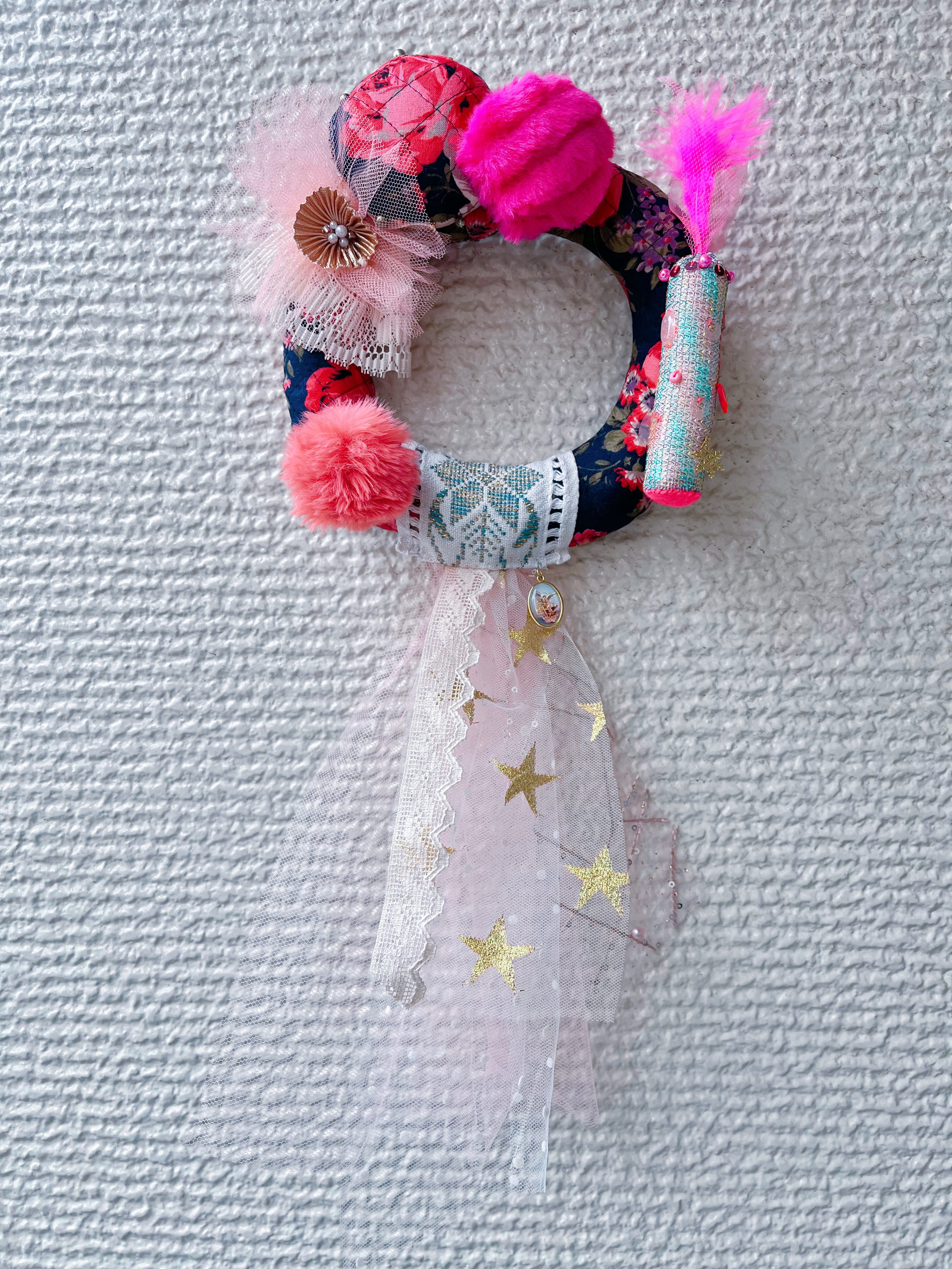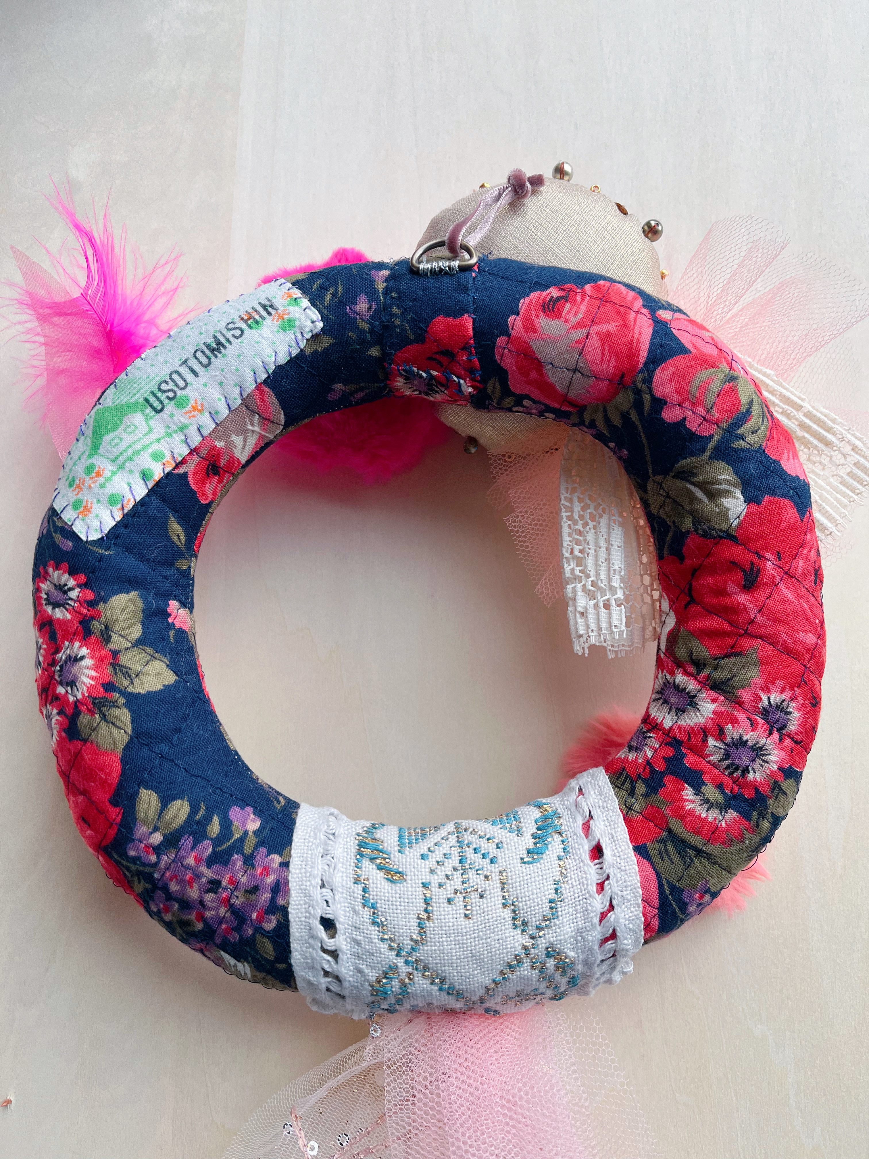ドーナツのように丸く仕立てた直径20㎝のリース本体には、バラ模様の日本のヴィンテージキルトを使っています。