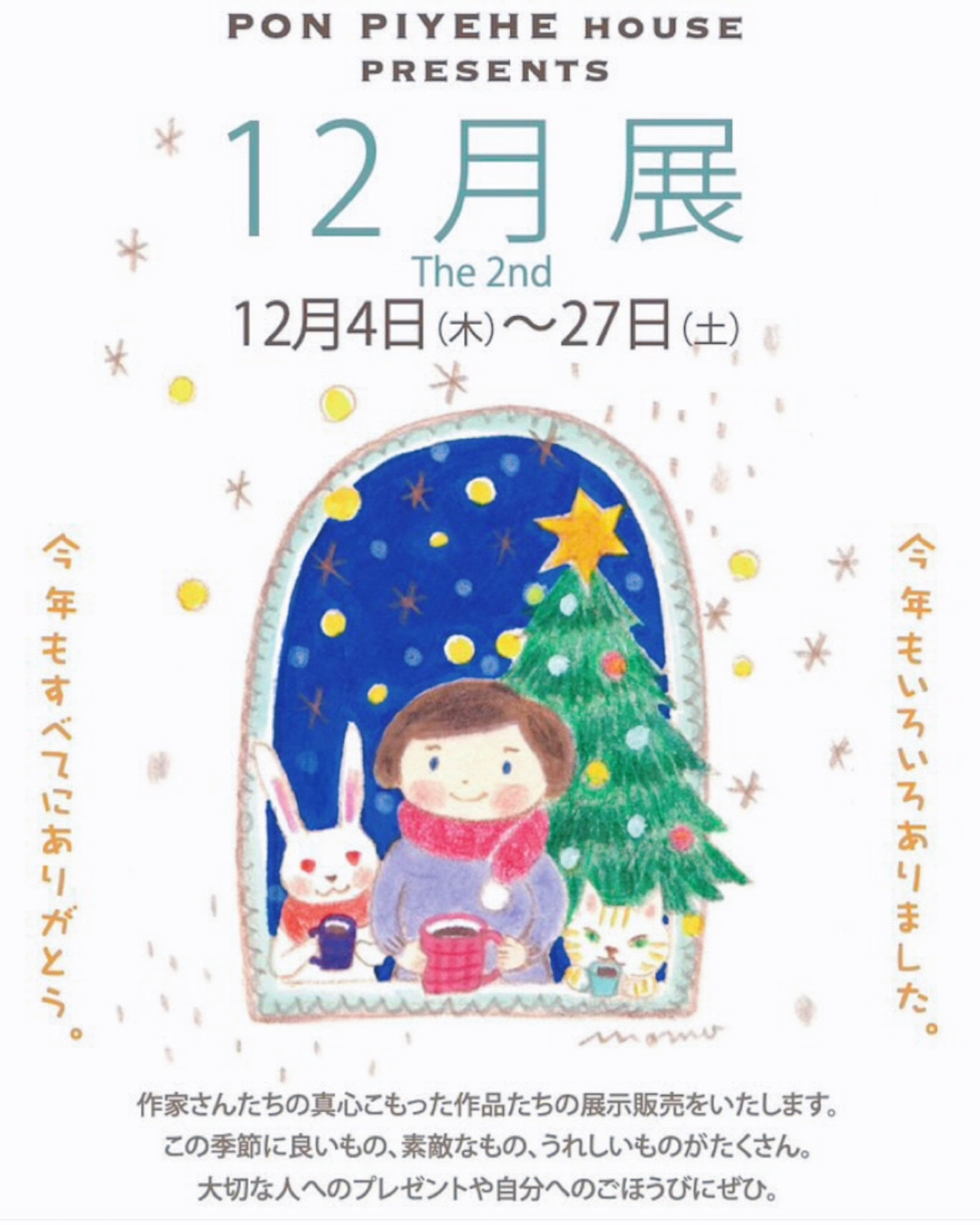 個展は終わりましたが、年内最後のイベントとして12/4〜27の期間、札幌円山にある一軒家のギャラリー&カフェ「Pon piyehe house (ポンピイェ ハウス)」さんで開催される「12月展」