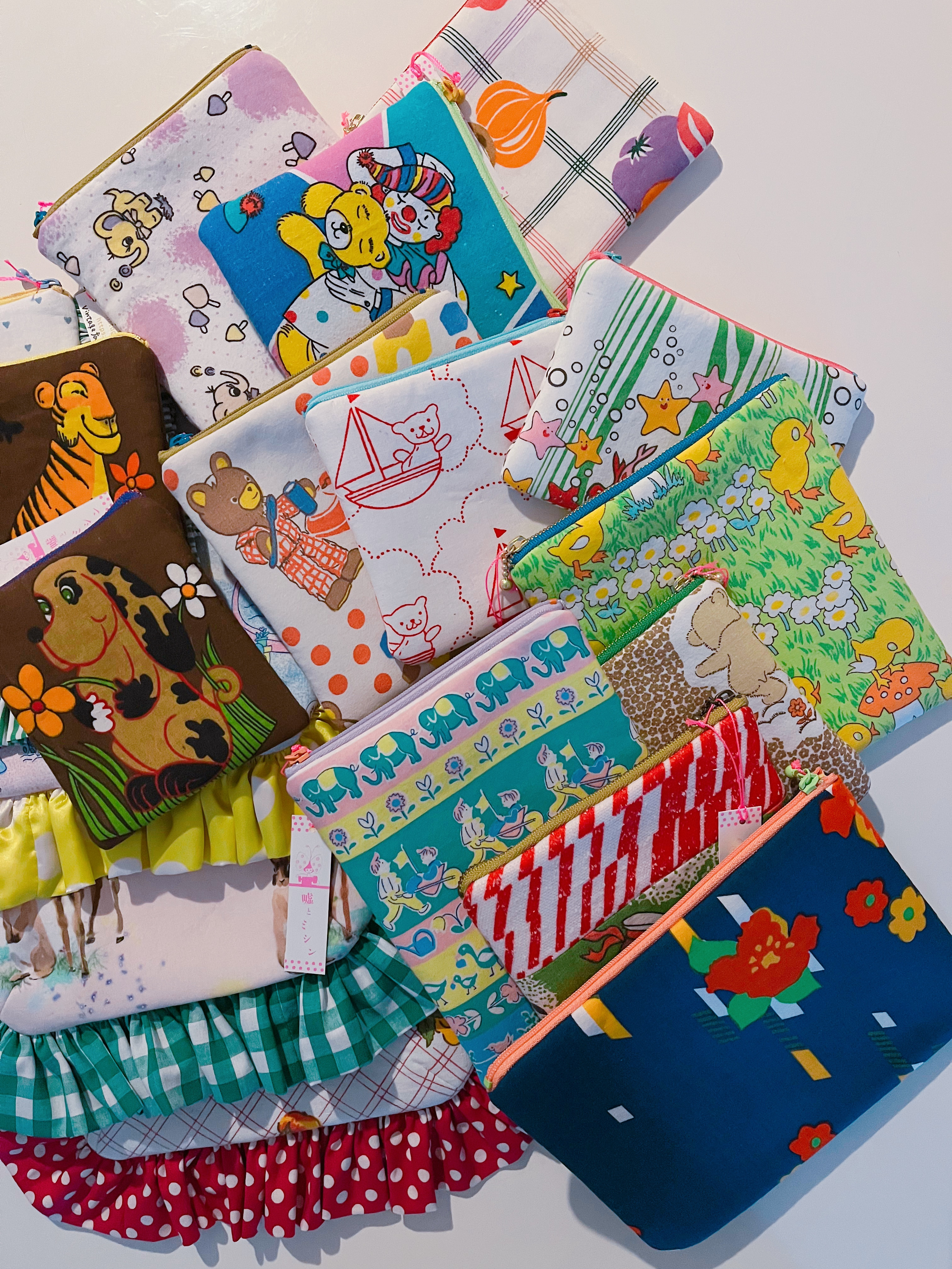 「面影アパートメント」にはおなじみヴィンテージファブリックを使ったポーチもたくさん並びます。