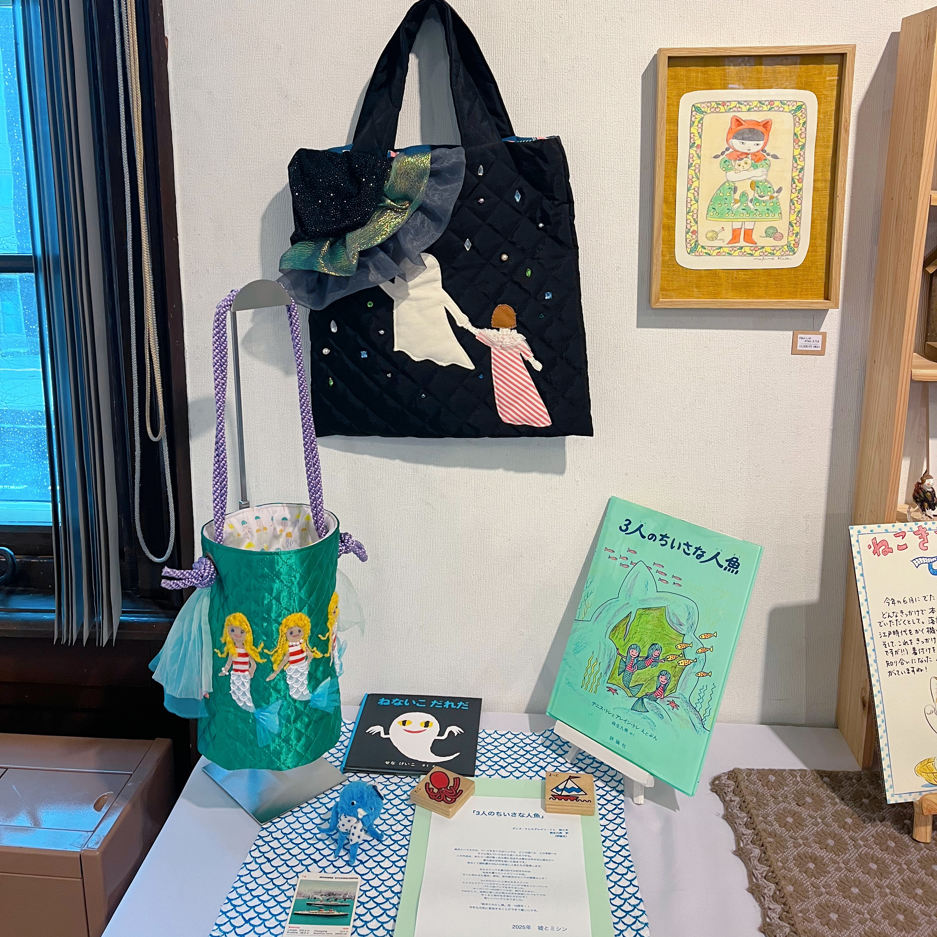記念すべき第1回目の作品「ねないこだれだバッグ」とともに今年の作品を展示した様子