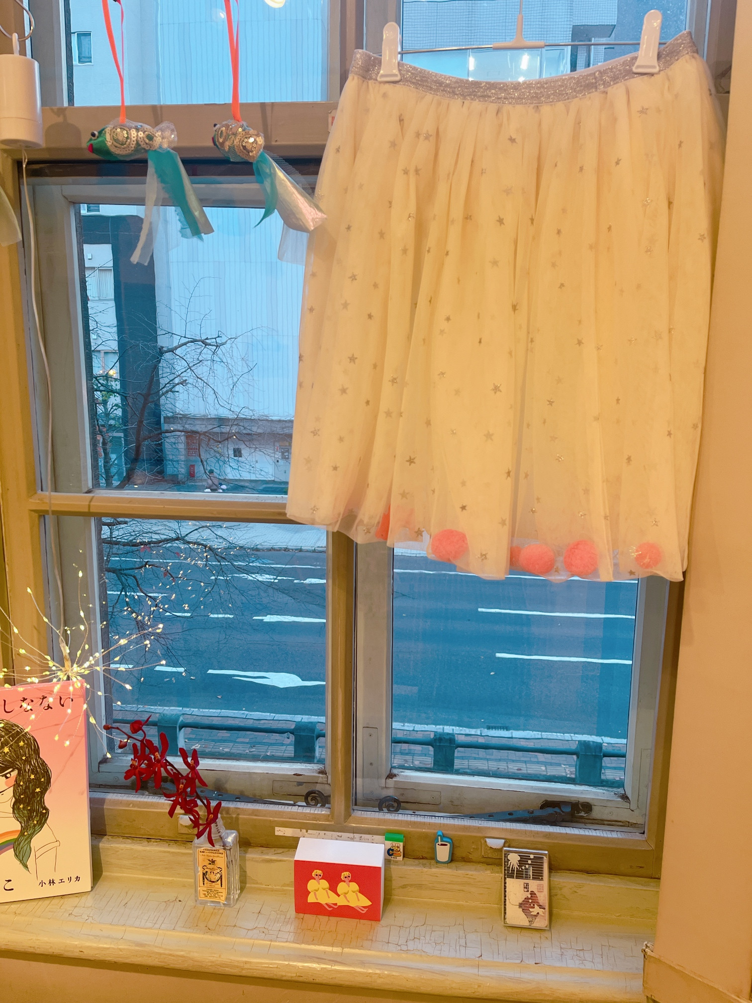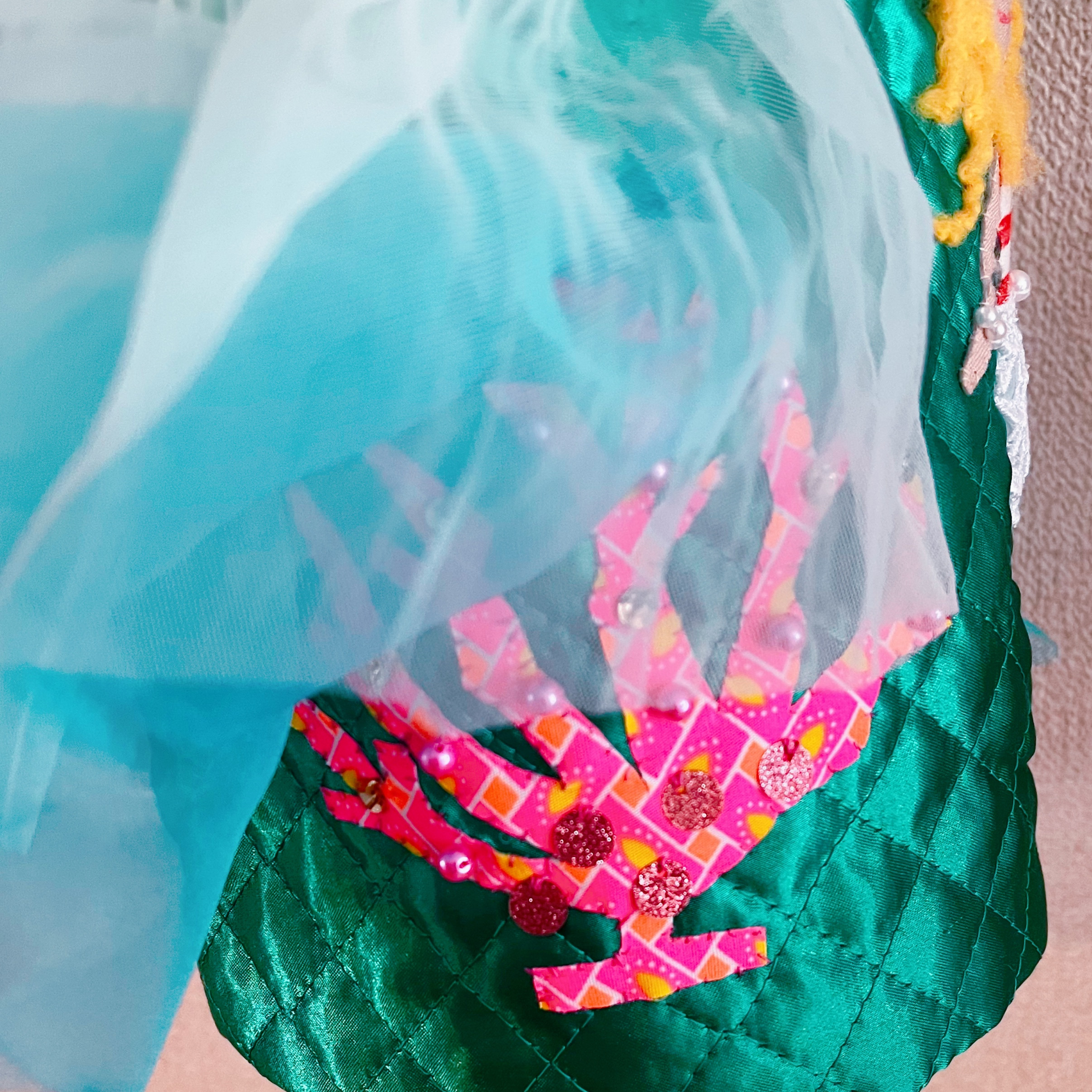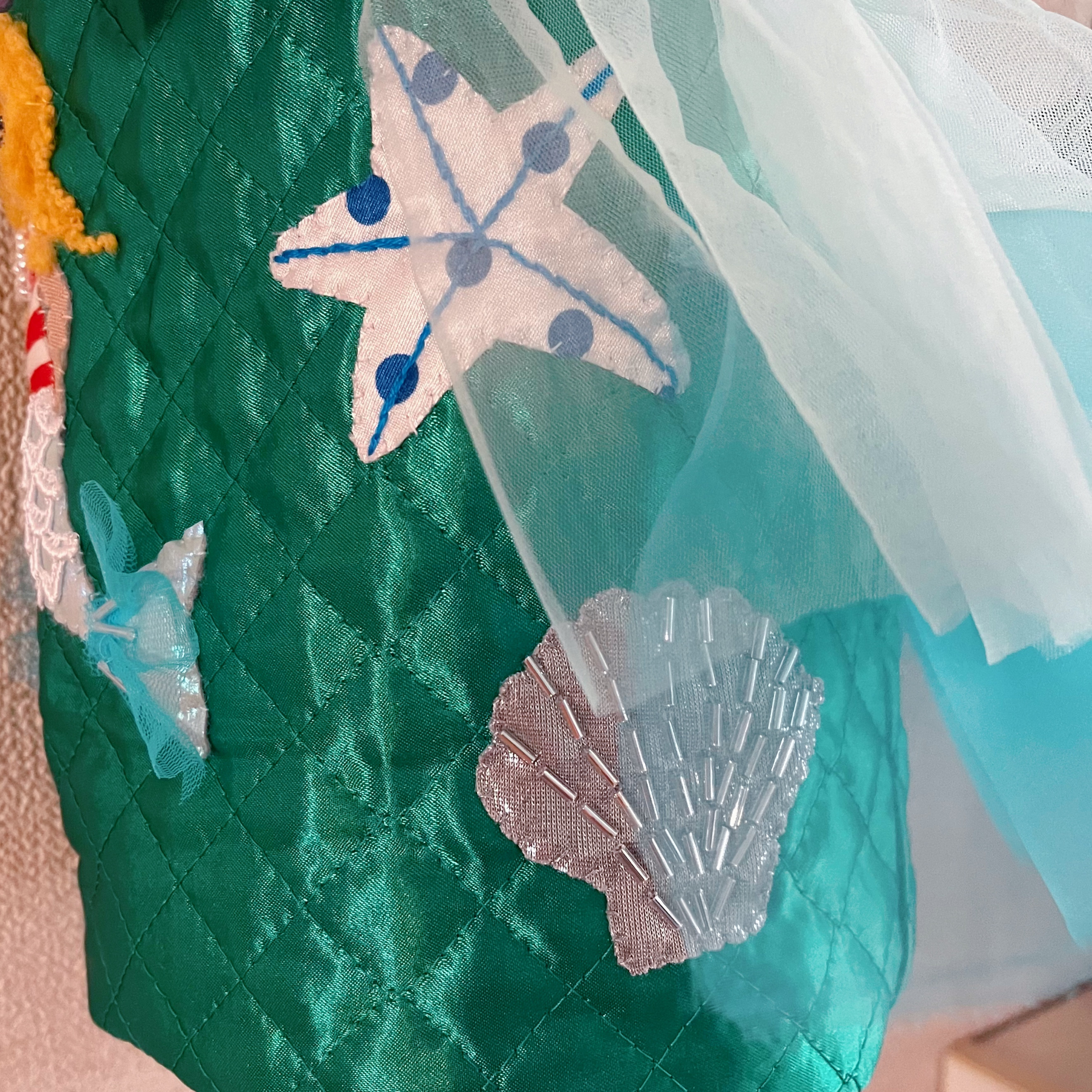 人魚の反対側には海底に差し込む光を表現すべく、2枚重ねのチュールをつけました。